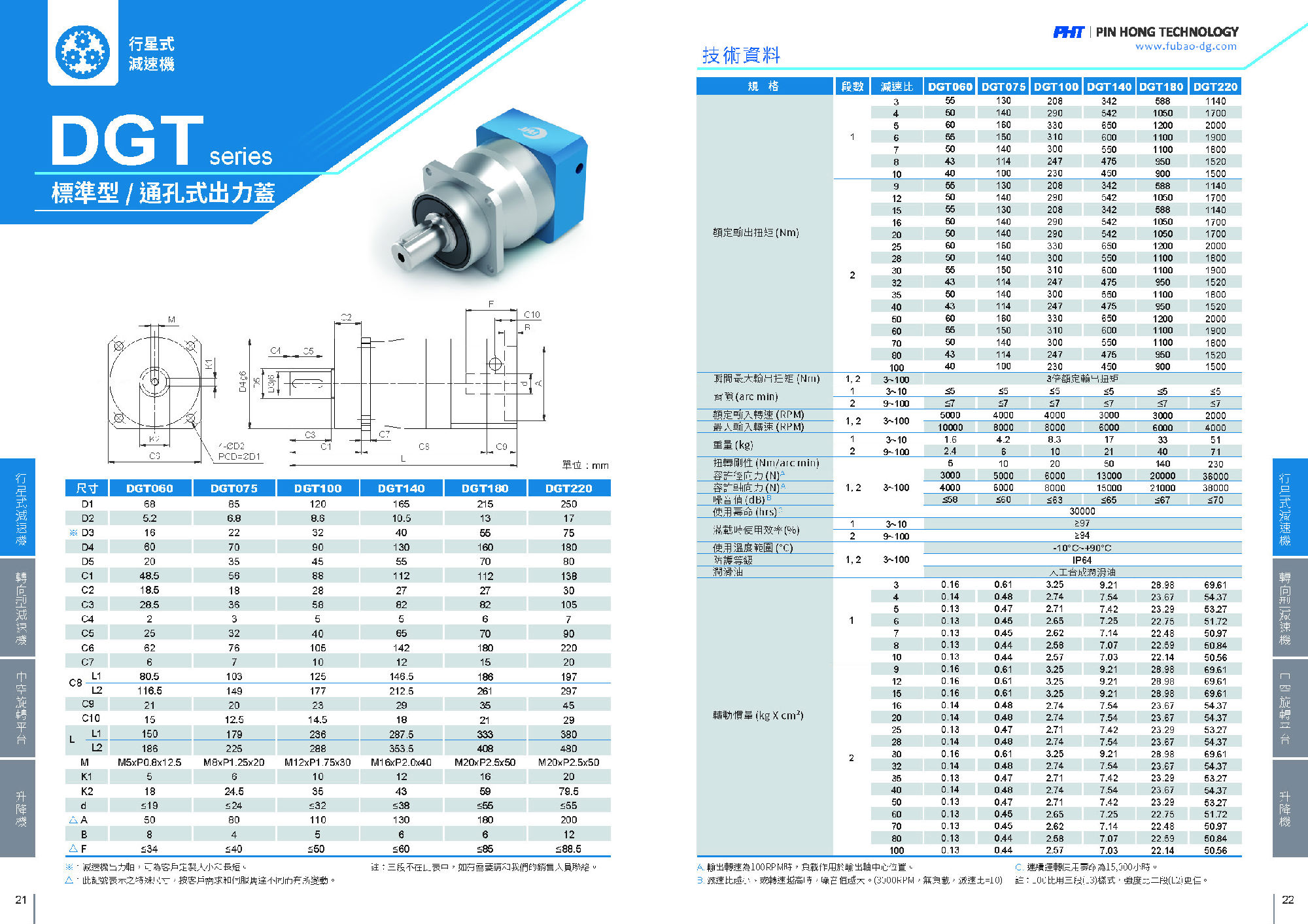 DGT系列是標準型高精度減速機。 適合精度定位之需求,齒輪采用合金鋼材,內部搭配圓錐滾子軸承,使之可承受更佳的負載,安裝孔位為通孔式。 品宏減速機的軸承是用NSK品牌的,齒輪經過碳化,故精度和剛性都比較優越!減速機出力軸是可根據客戶的要求去定制大小和長短的。
